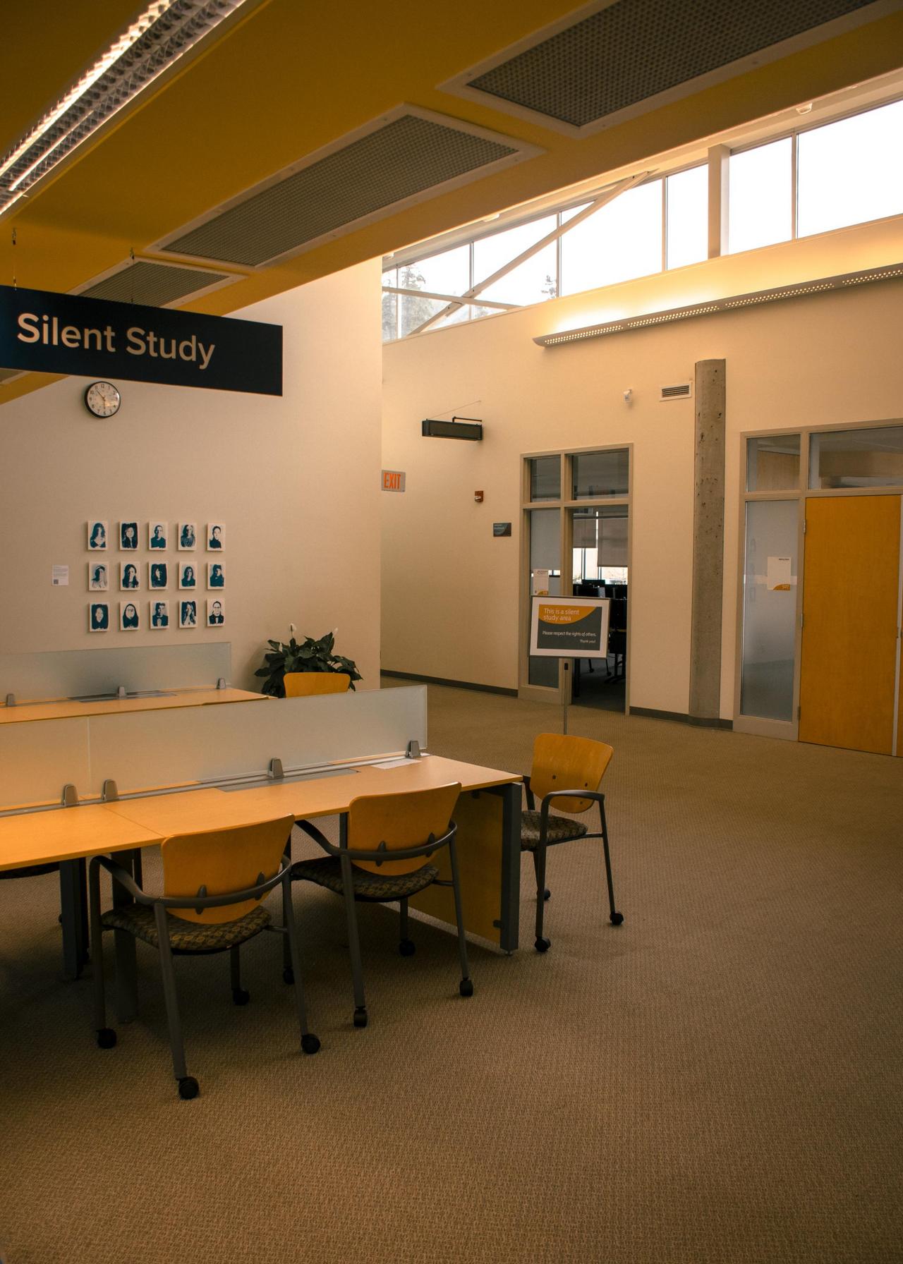 A still moment in a silent study space, where light pours through angled windows, shadows stretch gently across carpeted floors, and focus settles like dust in the air. A quiet tribute to the spaces graduate students seek, not just for study, but for belonging.